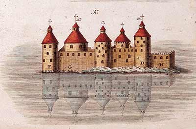Linnan katetut tornit. Kuparipiirros valmistettu Nürnbergissä 1762 (wikipedia).