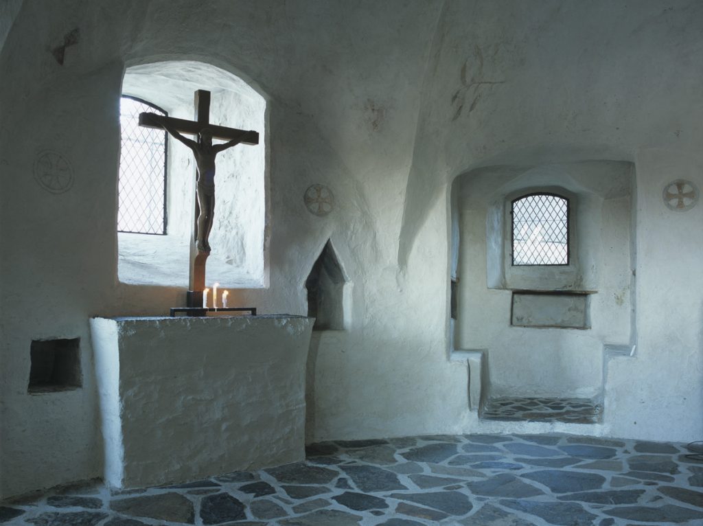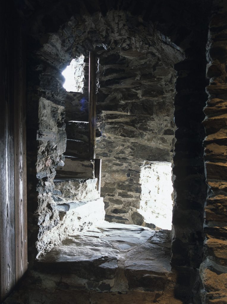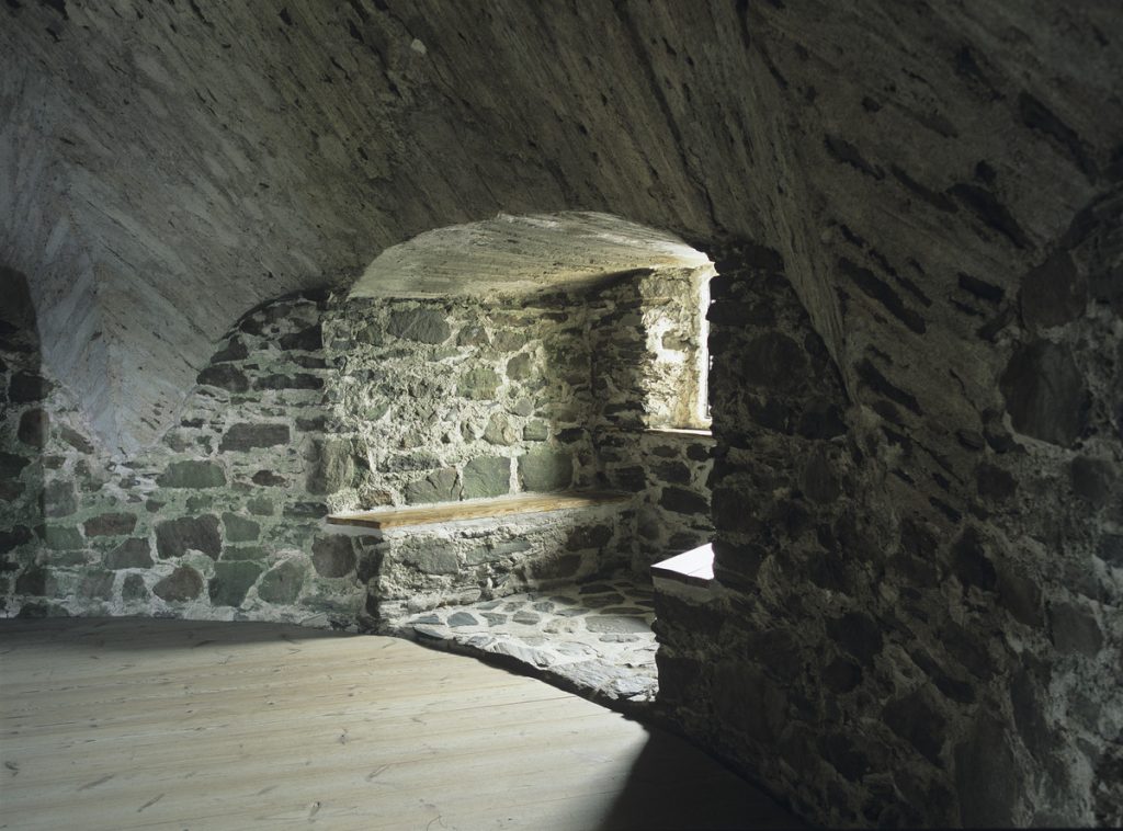 Soile Tirilän kuvia Olavinlinnasta (Finna.fi). Linnan kappeli ja ulkokuvassa linnan rakennuttaneen Erik Tottin vaakuna tornin seinässä.