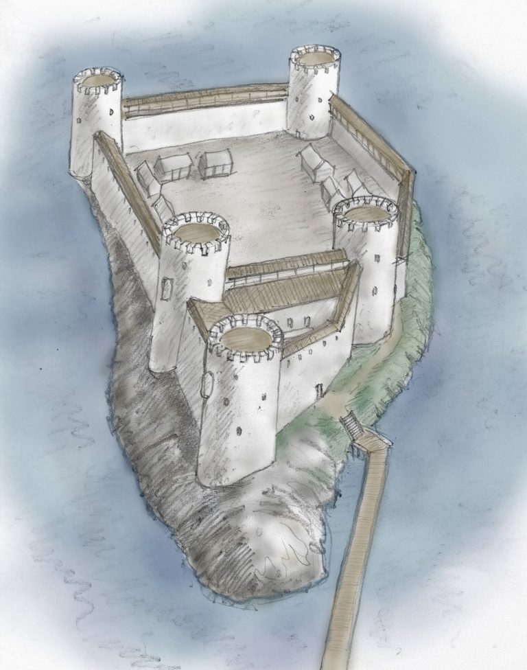 Saaren korkeimmalle kohdalle kohosi kolmiomainen päälinna, jonka kussakin kulmassa oli keskenään samankaltaiset korkeat pyöreät tornit. Huipultaan ne olivat sakaraharjaisia ja avoimia. Samalla vauhdilla rakennettiin loputkin saaresta kattava esilinna ja sen molemmissa takanurkissa oli päälinnan kaltaiset korkeat pyöreät sakaraharjatornit. Päälinnan ulkoportti oli suoraan sen seinässä ilman esilinnaa.